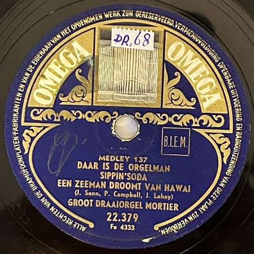 Deze 78-toerenplaat op het label Omega bevat twee medleys uitgevoerd door het Groot Draaiorgel Mortier. Het karakteristieke blauwe Omega-label met orgelafbeelding en BIEM-vermelding wijst op een Europese uitgave uit de middenperiode van de 20e eeuw.